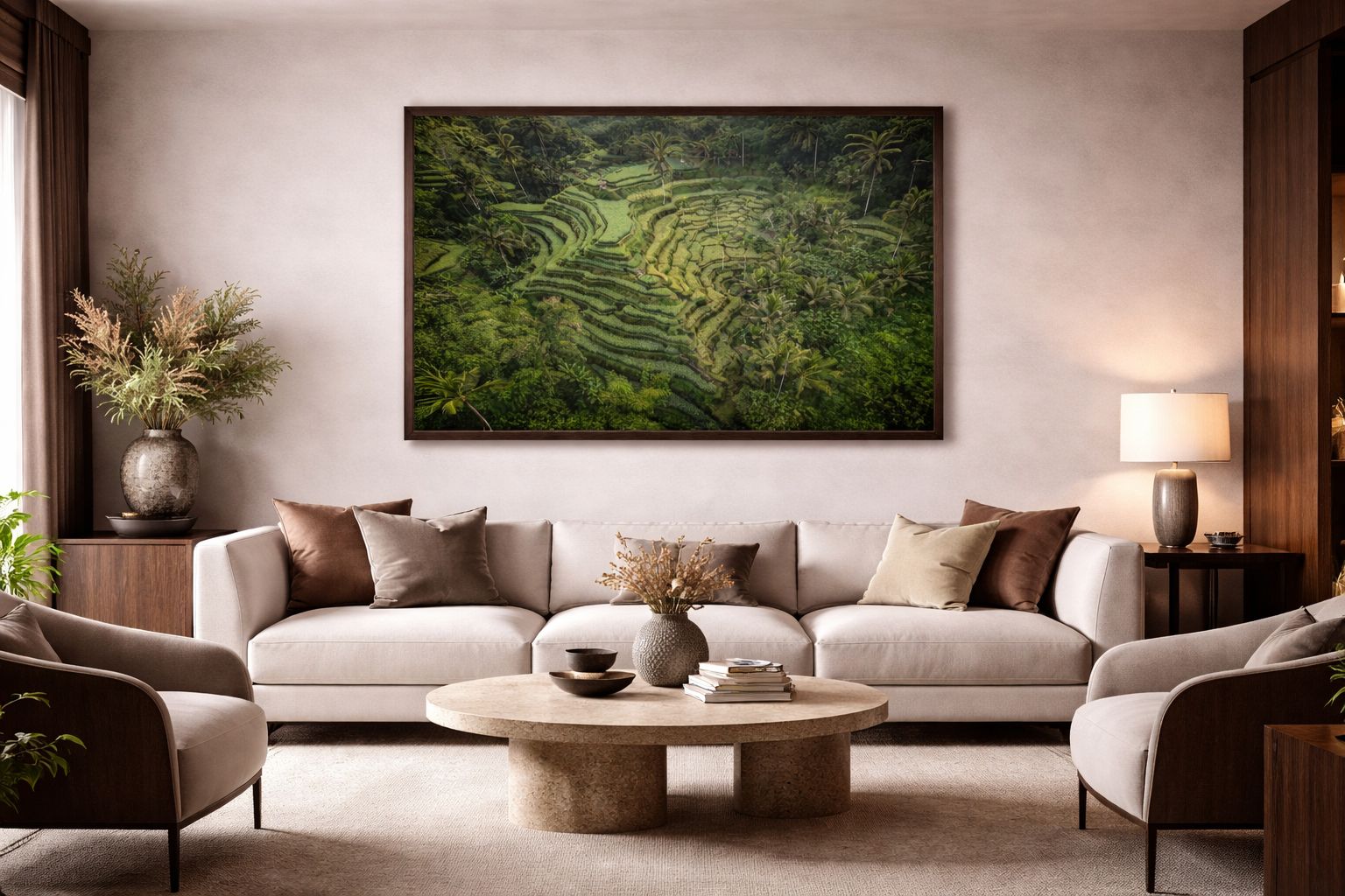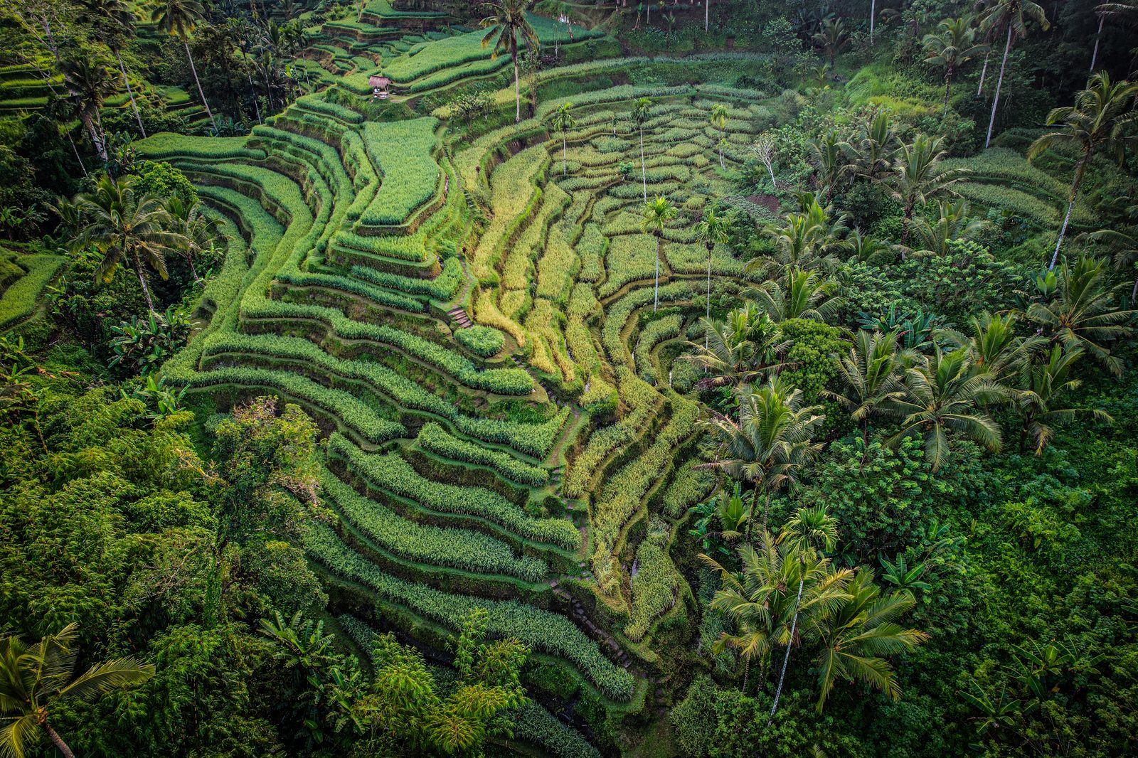 Aerial view of the terraces of Tegalalang, Bali. The rice fields trace smooth curves across the hills, between slender palms and shifting shades of green shaped by the seasons.